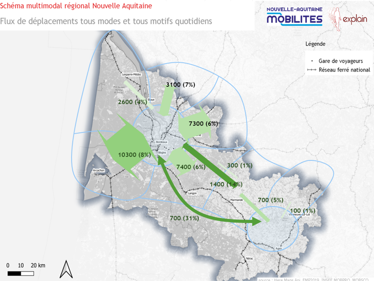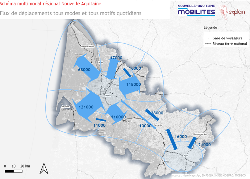 Ces données de flux, exploitées dans le cadre du Schéma Multimodal de Nouvelle-Aquitaine sont issues d'un traitement de plusieurs bases de données réalisé par le bureau d'études Explain :