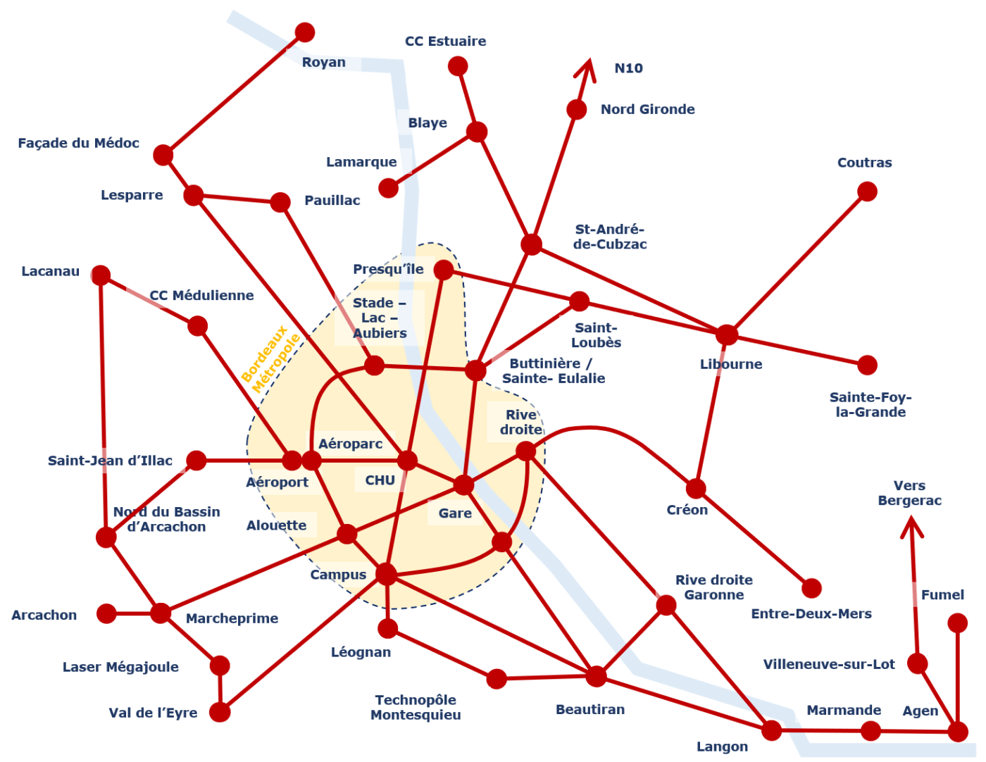 Il en ressort que la métropole bordelaise est dotée de plusieurs équipements qui rayonnent bien au-delà : l’aéroport et la zone d’emploi Aéroparc, les campus universitaires, les CHU et la zone Bordeaux-Lac. Ces zones doivent être accessibles depuis les localités situées sur les axes radiaux visibles sur le schéma ci-contre. La métropole rayonne dans plusieurs directions, notamment Arcachon, le Libournais ou encore le Val de Garonne.