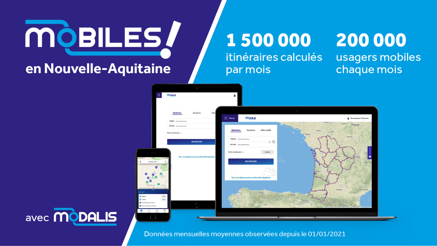 Modalis s'affirme de plus en plus comme un compagnon de route privilégié pour les déplacements en Nouvelle-Aquitaine. Ce sont en effet plus de 200 000 personnes qui utilisent le système d'information Modalis chaque mois pour consulter les horaires de passage, suivre l'info trafic et calculer leurs itinéraires (plus d'un million et demi chaque mois) en bus, train, vélo, à pied ou en co-voiturage puisqu'en effet, le site modalis.fr et l'application Modalis intègrent les principaux opérateurs de co-voiturage.