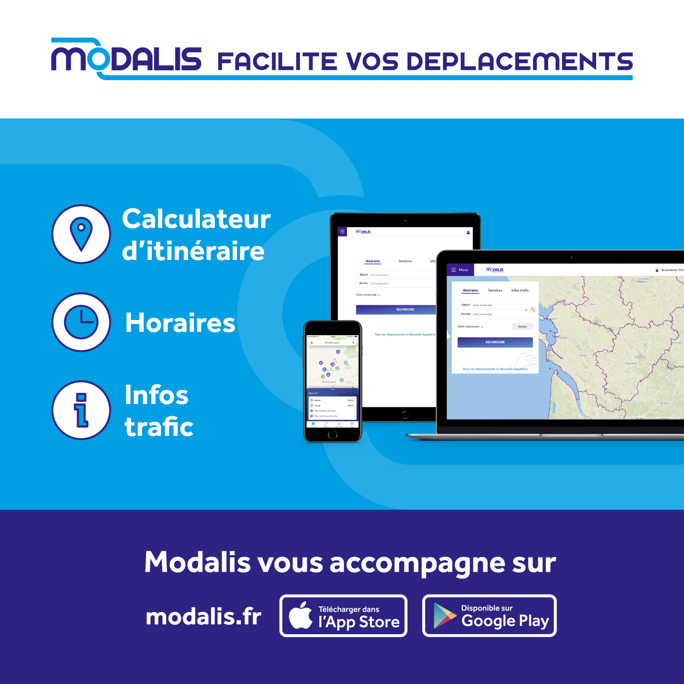 Depuis un an déjà, en plus du calculateur modalis.fr , il est possible d'acheter son titre de transport dématérialisé avec l'application Ticket Modalis ou de voyager sur différents réseaux avec la carte Modalis. Demain, ces services seront disponibles au sein d’un média unique et enrichi de nouvelles fonctionnalités pour faire de Modalis le compagnon de route des usagers en Nouvelle-Aquitaine. Ainsi, où que vous soyez et quel que soit votre profil, vous pourrez programmer votre trajet, réserver vos billets et valider sur les différents réseaux partenaires depuis une seule et unique interface ou agence de mobilités.