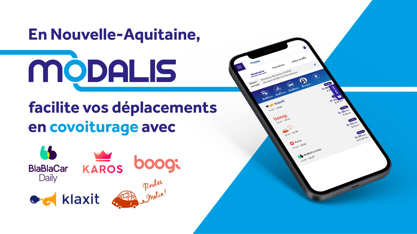 Depuis quelques semaines, les trajets en covoiturage proposés par Karos et Blablacar Daily sont disponibles sur Modalis, venant enrichir les trajets déjà proposés par Klaxit, Boogi et Roulez Malin. L'intégration du covoiturage au calculateur d'itinéraire Modalis est le fruit d'une collaboration fructueuse entre Nouvelle-Aquitaine Mobilités et ses opérateurs partenaires.