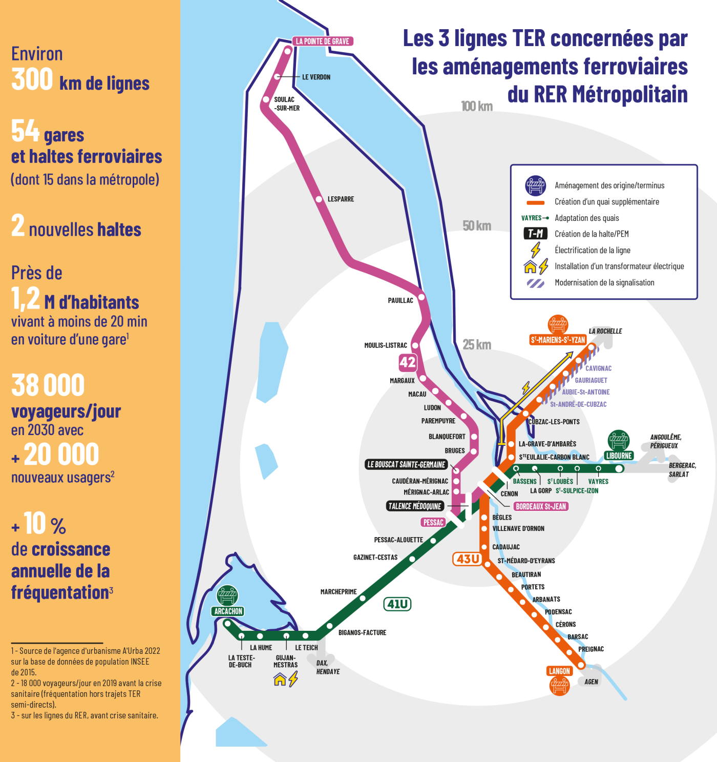 Intermodalité, diamétralité et haut niveau de service ; le RER offre une alternative crédible à l'auto-solisme pour les déplacements trans-métropolitains. En combinant la souplesse d’un réseau de proximité (car express, mobilités alternatives, transports urbains…) à la robustesse d’un réseau ferré ; le RER métropolitain propose une solution de mobilité intermodale pérenne et adaptée aux enjeux de l’aire inter-urbaine bordelaise.